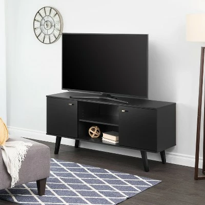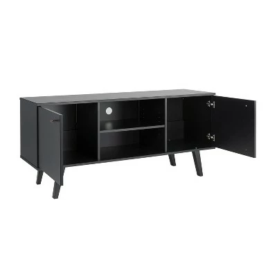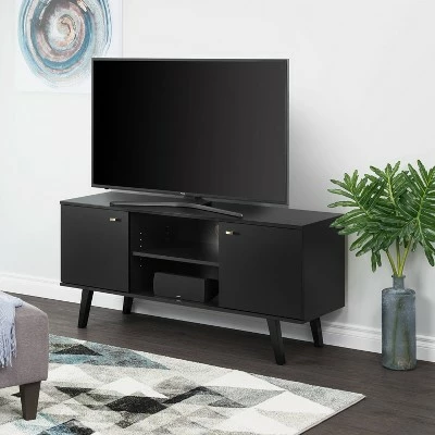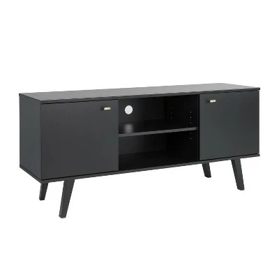 The Prepac Milo 56″ TV Console is a modern take on a retro style. The console’s mid-century modern design and functionality make it the perfect fit for all entertainment spaces. Its sleek design offers space for all of your entertainment storage needs. Place TVs up to 65″ on top of the console, and store media accessories below in the three compartments. Place books, games and DVDs behind the two large doors and use the middle compartment with an adjustable shelf to place cable boxes and gaming consoles. Keep wires neatly organized and concealed with the cut-out in the middle compartment. Tapered solid wood legs ensure durability and the brushed brass finished knobs deliver a vintage look. Clean lines add to the retro-chic design of this functional and stylish console. Constructed from non-toxic, CARB-2 compliant, laminated composite woods. Ships Ready to Assemble, includes an instruction booklet for easy assembly and has a 5-year manufacturer’s limited parts warranty. Manufactured in Canada and meets all North American safety standards.