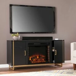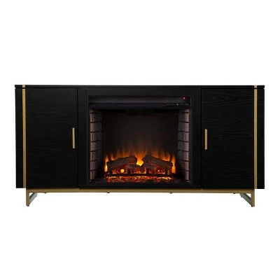 Bring home sleek, sophisticated style with the Aiden Lane Monwit Electric Fireplace Console with Media Storage. Gold accents give your living space a modern feel, while two cabinets and adjustable shelves tuck away books, movies, or spare electronics with ease. Flickering LED flames and remote-controlled features add a chic, contemporary edge to your home, working with or without the heater for use all season long. Enjoy cozy warmth and convenient storage in your den or media room with this two-tone electric fireplace.