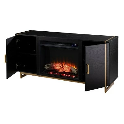 Bring home sleek, sophisticated style with the Aiden Lane Monwit Touch Panel Electric Fireplace Console with Media Storage. Gold accents give your living space a modern feel, while two cabinets and adjustable shelves tuck away books, movies, or spare electronics with ease. Flickering LED flames and remote-controlled features add a chic, contemporary edge to your home, working with or without the heater for use all season long. Enjoy cozy warmth and convenient storage in your den or media room with this two-tone electric fireplace.