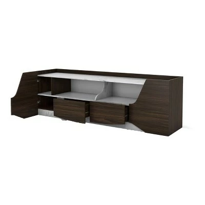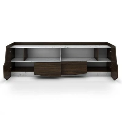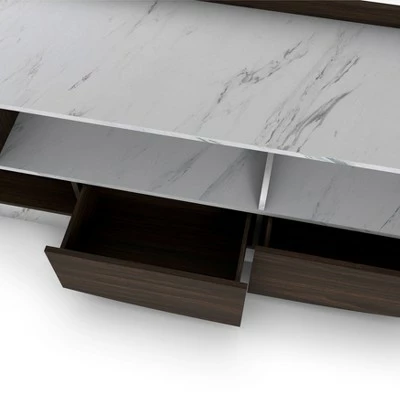 A stunning disparity of the sleek espresso wood casing that embraces the white marble gives the TV stand a modern appeal. A lipped tabletop with the walled trim along all edges is cut-off to showcase two open shelves with a curved center divide. Two hidden drawers and cabinets are concealed by the sleek brown frame.