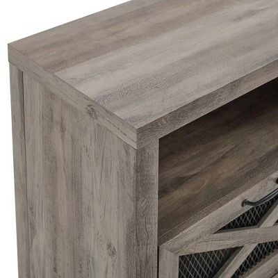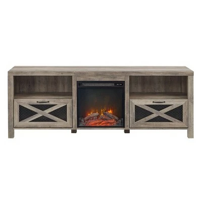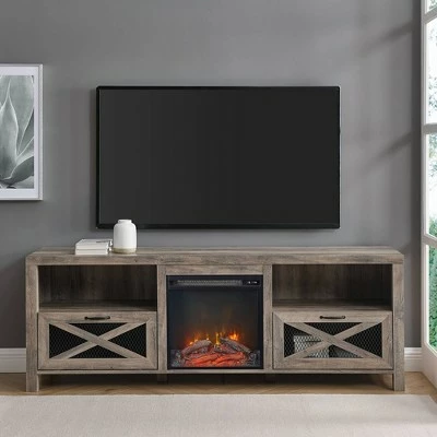 Rejuvenate your entertainment setup with Saracina Home’s Newark Industrial Farmhouse Drop Down Metal Mesh X Door 70″ TV Stand with Electric Fireplace. The easy-to-install electric fireplace insert ignites new warmth into your living room. Separate switches control the heat and the LED flames, so you can choose one or both to fit your mood. Two open shelves are the perfect place to display our media components, while the two drop-down doors keep your space looking organized. The doors’ X fronts and metal mesh panels provide the perfect rustic accompaniment to your cozy atmosphere.