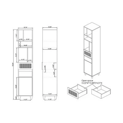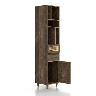 Mid-century modern style meets modern-day bohemian trends on this storage tower. The space-conscious design sits on adorable tapered feet and offers a modest mesh can webbed drawer. In addition to the five open shelves, hidden storage is found in a lower drawer and cabinet.
