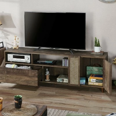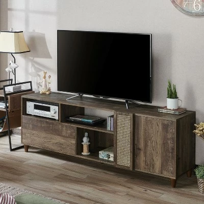 Open up spacious room for modern entertaining ensembles, and treat yourself to movie nights, sports weekends, and everything in-between. The rustic reclaimed wood finished ambiance of this Niles 80″ TV Stand from Homes: Inside + Out imparts a casual and cozy aesthetic to your surroundings. The beauty of the rustic reclaimed wood finish is accentuated with a mesh caning panel. Three shelves, a drawer and a cabinet store your DVDs, components, and accessories as needed.