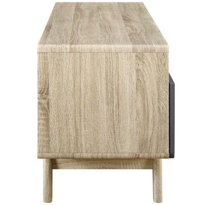 Effect mid-century style as your decor destination with the Origin 47″ TV Stand. Featuring a linear silhouette with rounded corners, Origin comes with two full-extension concealed storage drawers and durable fiberboard construction for reliable support. Available in either walnut grain veneer with spacious white drawers or natural grain veneer with gray drawers, Origin has a look perfect for your contemporary living room decor. Complete with open media storage shelves with cable management, organize your game system, DVD or Blu-ray player storage while keeping your visual space clean with this versatile TV stand. Accommodates flat screen TVs up to 5 inches.