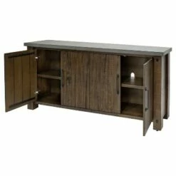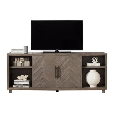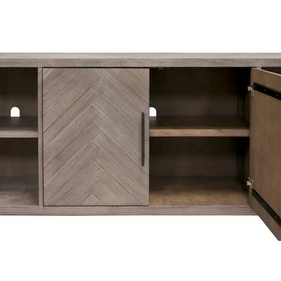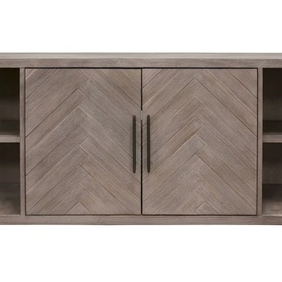 Palisades boasts transitional luxury with a touch of glam that fits perfectly with contemporary décor. Herringbone patterned door fronts with unique textured iron hardware lends an understated accent. Bushed gray finish has been distressed to highlight the woods natural grain. This item has three adjustable shelves and is delivered fully assembled.