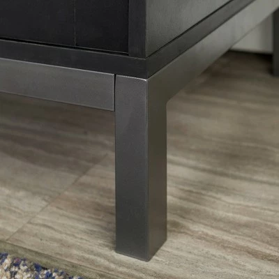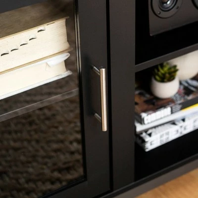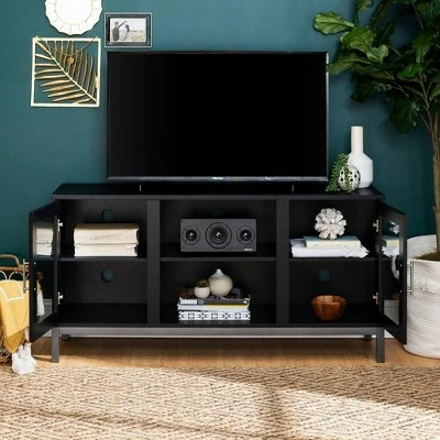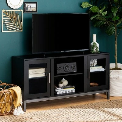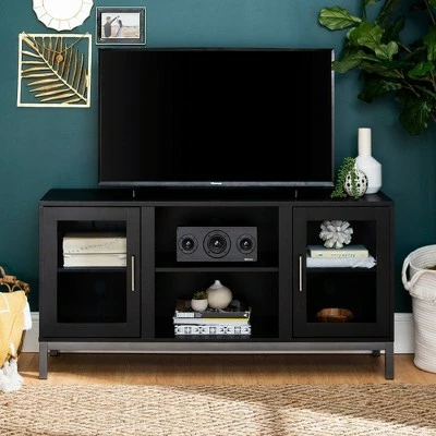 Bring a touch of modern style to your room with the wood TV console with metal legs from Saracina Home. This console supports televisions up to 55 inches and has ample storage space to keep clutter to a minimum. The handy cable management holes in the back of the console keep cords neatly organized and out of sight for a clean and sophisticated look.