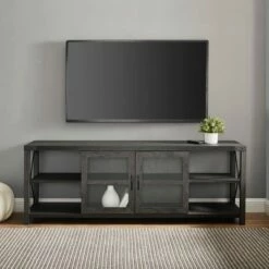 Sophie Rustic Farmhouse X Frame Glass Doors TV Stand for TVs up to 80″ – Saracina Home Sable Gray