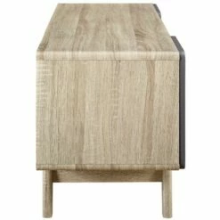Tap into mid-century aesthetics with the Render 48″ TV Stand. Render features a durable particleboard frame with smooth walnut grain veneer, four tapered wood legs, full-extension center drawer with shelf on top, non-marking foam foot pads, and opposite side adjustable shelves with dual slatted sliding doors for sophisticated media storage. Complete with cable management holes on both sides, Render’s contemporary linear style is the perfect addition to the modern living room, lounge or recreation area.