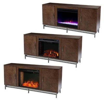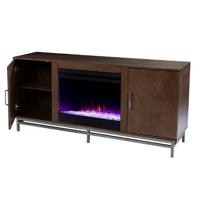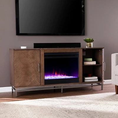 Upgrade your media space with the Aiden Lane Retim Color Changing Fireplace with Media Storage. A subtle herringbone design decorates the cabinet doors, while the spacious top holds your flat screen TV or modern décor. Color changing flames reflect off the faux crystal fill, creating cozy ambiance with a contemporary twist in your living area or game room. Put a fresh take on movie night when you bring home this freestanding fireplace.
