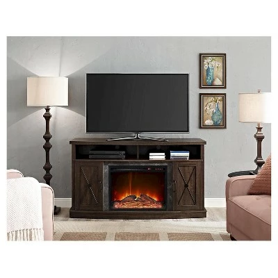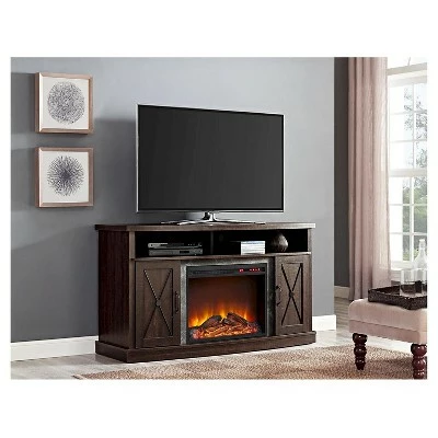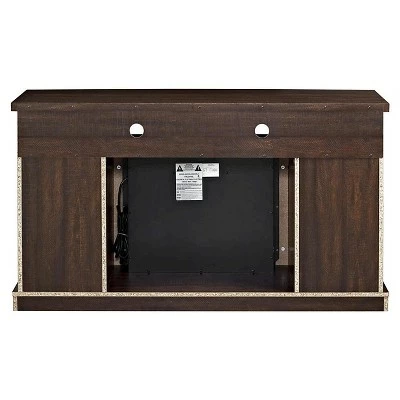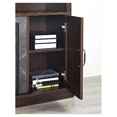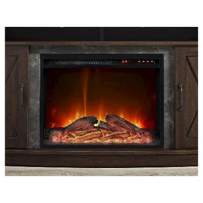 Update your living area with the two-in-one Fireplace and TV Stand that not only is functional but adds a bit of beauty to your room. This Room & Joy Fairmount Fireplace Console is designed with a slight outward curve to stand out from most square Fireplace Consoles and is embellished with the warm espresso finish and faux stone surrounding the fireplace insert. The unique curve gives you added space for your big screen and for the storage compartments underneath. The 2 doors have a decorative X-design on them and open up to adjustable shelves for all your AV must haves. An electric 23” fireplace insert does a spectacular job at heating up smaller rooms and creating a warm atmosphere. TV Console can accommodate 60” flat panel TVs. This unit is constructed of MDF, particleboard and glass with a metal fireplace insert for an affordable, stylish fireplace you will love. Room & Joy Fairmount Fireplace Console requires assembly and will stand 29.9″h x 53.5″w x 18″d after assembled.