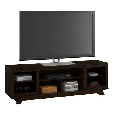 Update your living room with the Room & Joy Parkway TV Stand. This Stand can accommodate most flat screen TVs up to 80″ wide or 145 lbs. so you can watch the big game or your favorite movie in style. The center shelves are perfect for your DVD player, cable box, and audio equipment. Behind each of the glass doors are 1 adjustable and 1 fixed shelf with wire management holes for extra components and your DVD and game collections. The low profile and decorative base give extra stability to the Stand and takes up less space so your room feels more open. The finish on the laminated MDF and particleboard adds a classic look that looks great in any room. The TV Stand ships flat to your door and requires assembly upon opening. Two adults are recommended to assemble. Once assembled, the Stand measures to be 22.61″H x 71.61″W x 17.52″D.