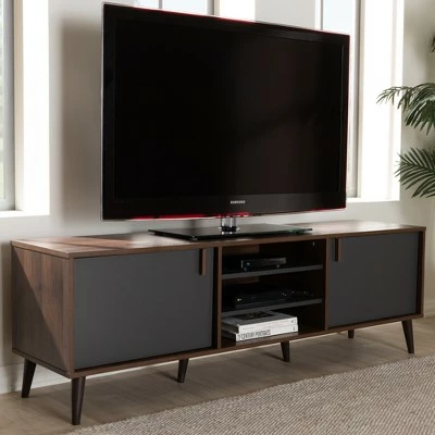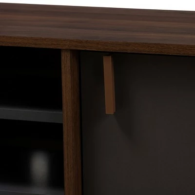 Organize your entertainment space in style with the Samuel TV stand. The modern and contemporary-inspired design elements come through in the straight lines and solid colors of the television stand. The Samuel’s engineered wood frame is finished in brown with dark gray