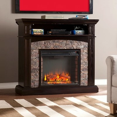 Ignite your senses and illuminate your home with the Aiden Lane Decorative Fireplace. Serving as an entertainment console beneath a wall mounted TV, this electric fireplace features lifelike faux river stone surrounding the firebox. A rich brown hue adds an elegant look, enhancing your traditional décor. A flip up panel offers hidden storage, ensuring your remotes and electronic devices are neatly organized. Gather family and friends around this electric fireplace and warm your home in classic cool style. Take refuge in soft cozy textures while clean lines and angles create a well balanced design. From intimate seating to ambient lighting, Aiden Lane transforms your house into a home.
