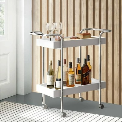Add wheels to your scrumptious snacks and drinks with the introduction of this versatile Storage Cart. Incorporated with two tier storage facility, it is supported on casters for mobility. Constructed sturdily from the CARB certified wood product to ensure a stable equilibrium with nature and health, the tubular metal frame is an add on to its sturdiness. The glossy white accented top is complemented with a chrome coated metal frame, adding an enchanting visual flair. Be it a convivial gathering or a small get together, this Storage Cart will be there to whisk snacks and drinks to the guests. The tubular handles can be used to keep hand towels organized. The raised tray like edges prevent the items from falling off.