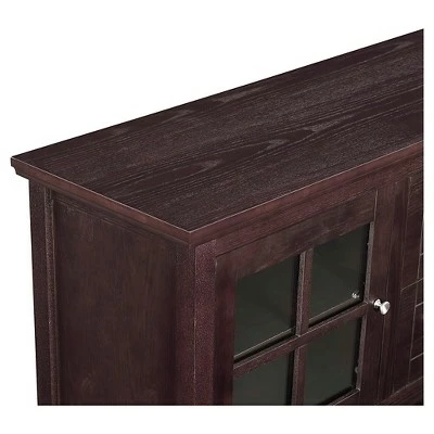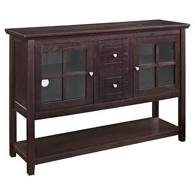 The Springville Modern Farmhouse Buffet with Lower Shelf from Saracina Home is a storage console with a stylish presence. The tempered safety glass window pane doors allow to steal a charming glance at the beautiful glass or place settings within while keeping them safe and sound. One adjustable shelf within each of the cabinets ensures that you can customize this sideboard to fit your storage needs. Odds and ends finally have a home within the two center drawers. One lower shelf gives you even more open space for storage bins or holiday décor. With the added cord management ports, this versatile unit can even be used as a TV stand in the living room for TVs up to 58 inches.