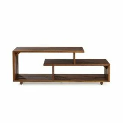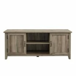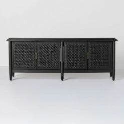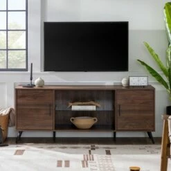 The Touraco TV Stand from Opalhouseâ„¢ lets you store and display your belongings in one cool, convenient design. Featuring a durable hardwood frame in a charming brown finish, this media stand has a smooth rectangular tabletop to hold your 55-inch flat-screen TV in place. It has two open shelves and cutouts at the back for keeping cords and cables organized, and is flanked by side cupboards to offer you plenty of displayed and hidden storage. Each side cupboard is designed with an artistic geometric-paneled and striped door in white to offer a striking contrast to the brown frame. Plus, this decorative stand is equally practical as a chic kitchen buffet or decorative display case in your home.