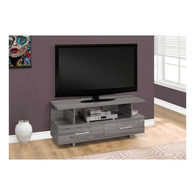 Add a contemporary elegance to your home decor with this chic gray TV stand. With ample surface area that accommodates all TV sizes with a center stand, this TV console will add style and functionality to your living space. Featuring 2 large storage drawers for DVDs, CDs, remotes, or gaming accessories, 3 open concept shelves perfect for placing electronic components, complete with an opening in the back to keep your wires out of site and organized in style. Sleek silver colored drawer handles and a smooth finish makes this contemporary TV console a must have in any home. Full assembly instructions are included.