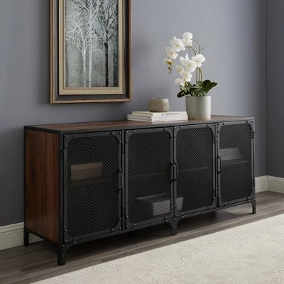 Integrate this 60-inch industrial TV stand into your home for additional storage space. In a stylish, rustic industrial aesthetic featuring mesh metal cabinets and in a durable laminate construction showcasing a wood grain finish. Providing three storage cabinets with adjustable shelves to organize anything from extra kitchenware to media and electronics. Set up in your entryway as a large entryway table with a canvas on the table top and vases filled with flowers, or as a storage cabinet in your bedroom for bins full of accessories from scarves to jewelry, or as a buffet in your kitchen. If used as a TV stand in your living room, it can support up to a 66-inch TV.