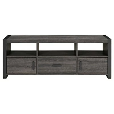 Your living or entertainment room can look even more stylish with this angelo:HOME Charcoal TV Stand. This piece of furniture offers ample storage for your media components, gaming devices and other electronic accessories. Crafted from durable manufactured wood, this flat panel TV stand is designed for TVs up to 65″” wide. The versatile design features a large drawer, two side cabinets and an open shelving system with a cable management function at the back. Pair this TV stand with matching items in the angelo:HOME collection.