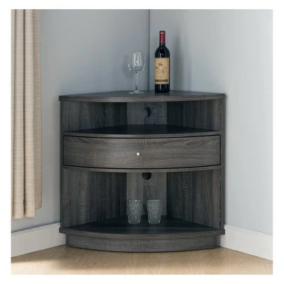 For smaller bedrooms, the Homes: Inside + Out Varela Contemporary Corner Cabinet TV Stand is the perfect solution to hold and display your media devices. Its clever corner construction saves floor space while also providing storage with its drawer and open shelves. Additional benefits are included with back openings made to organize and tuck away unattractive tangling wires completely out of sight while also providing convenient access to wall outlets. The stand’s distressed gray wood finish also makes it all the more appealing to the eye. Organize and save space with the Homes: Inside + Out Varela Contemporary Corner Cabinet TV Stand!