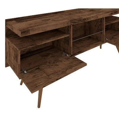 Showcasing contemporary elegance with a hint of a rustic touch, this 63 inches handcrafted TV Stand for flat screens will be a great addition to your living space. The particleboard, MDF, and solid wood construction makes it durable, while the brown finish is beautifully complemented with wood grain details to highlight the overall design. This media entertainment center is supported on angled tapered legs and incorporates four open compartments to accommodate media necessities.