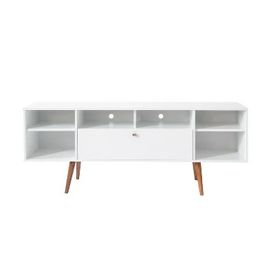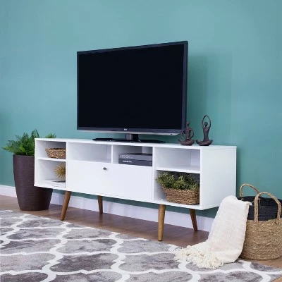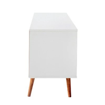Simply striking, this TV Stand is sure to add a remarkable charm to the aesthetics of your interior. Featuring 6 open compartments and a drop down storage, which conceals two compartments, the cut out holes offer easy wire management. Constructed sturdily from the wood frame for lasting durability, the striking white coating accentuates the brown tone legs. The round brass tone knob facilitates easy access to the drop down storage. Designed with diligence, this TV Stand blends in with a variety of decor settings without compromising the integrity of the interior. Supported on angled legs, the clean lined design makes it an ideal addition to any modern interior.