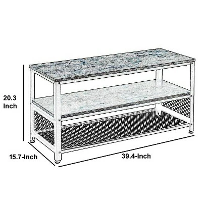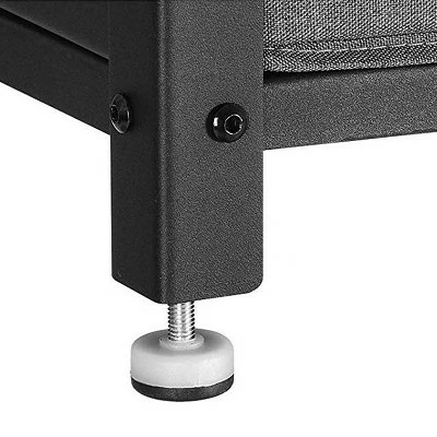 Bring this TV Stand to accentuate your home decor setting with a touch industrial style appeal. Durably constructed iron framed stand features a rustic brown finished particle board top which is spacious enough for any standard size television set while has bottom shelf with wide mesh design and other shelf in the middle to keep DVDs, cable box, gaming console and entertainment units, newspapers, magazines, storage baskets and various other items. This stand comes with the floor protectors that can prevent scratches on the floor and also can be adjusted to provide stability in the case of uneven floors.