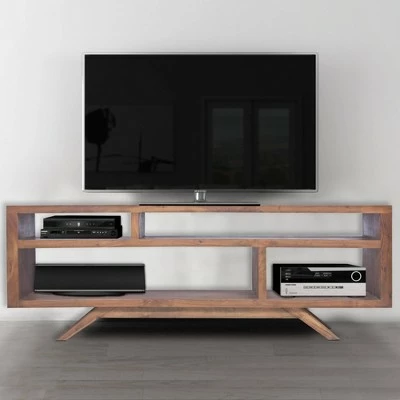Add style and character to your home decor with the inclusion of this acacia wood Tv Unit. Boasting a mid century modern design in a rectangular shape, it features 2 shelves with a single partition in each, offering you 4 open storage spaces that can be used for the decorative display and your media player. With the smooth top of 66 inches, one can easily use this piece of furniture for the placement of a widescreen TV(max. 62 inches), accompanied by collectibles, figurines, etc. Incorporating a rustic walnut brown finish for an appealing look, it is supported on splayed legs that provide a good support to the whole structure while giving it a good lift.